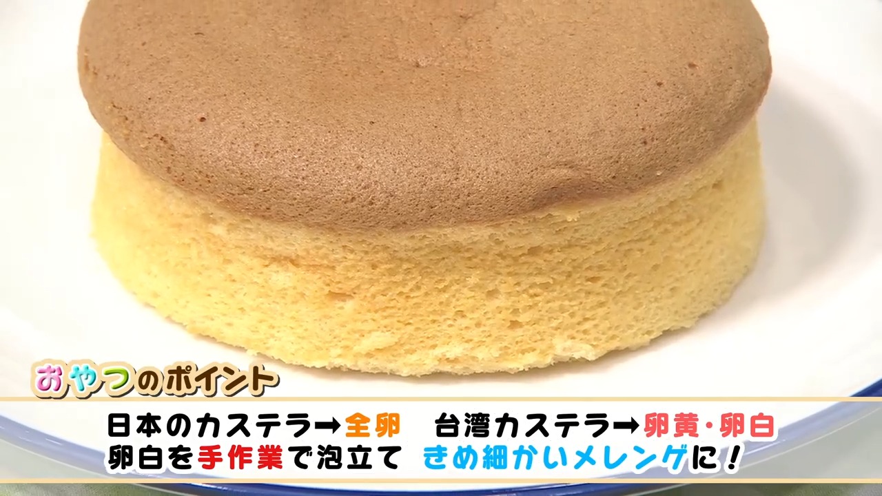 日本のカステラは全卵を使用していますが、台湾カステラは卵黄・卵白に分け、卵白を手作業で泡立ててきめ細かいメレンゲにし、それをつぶさないように生地を作っています。