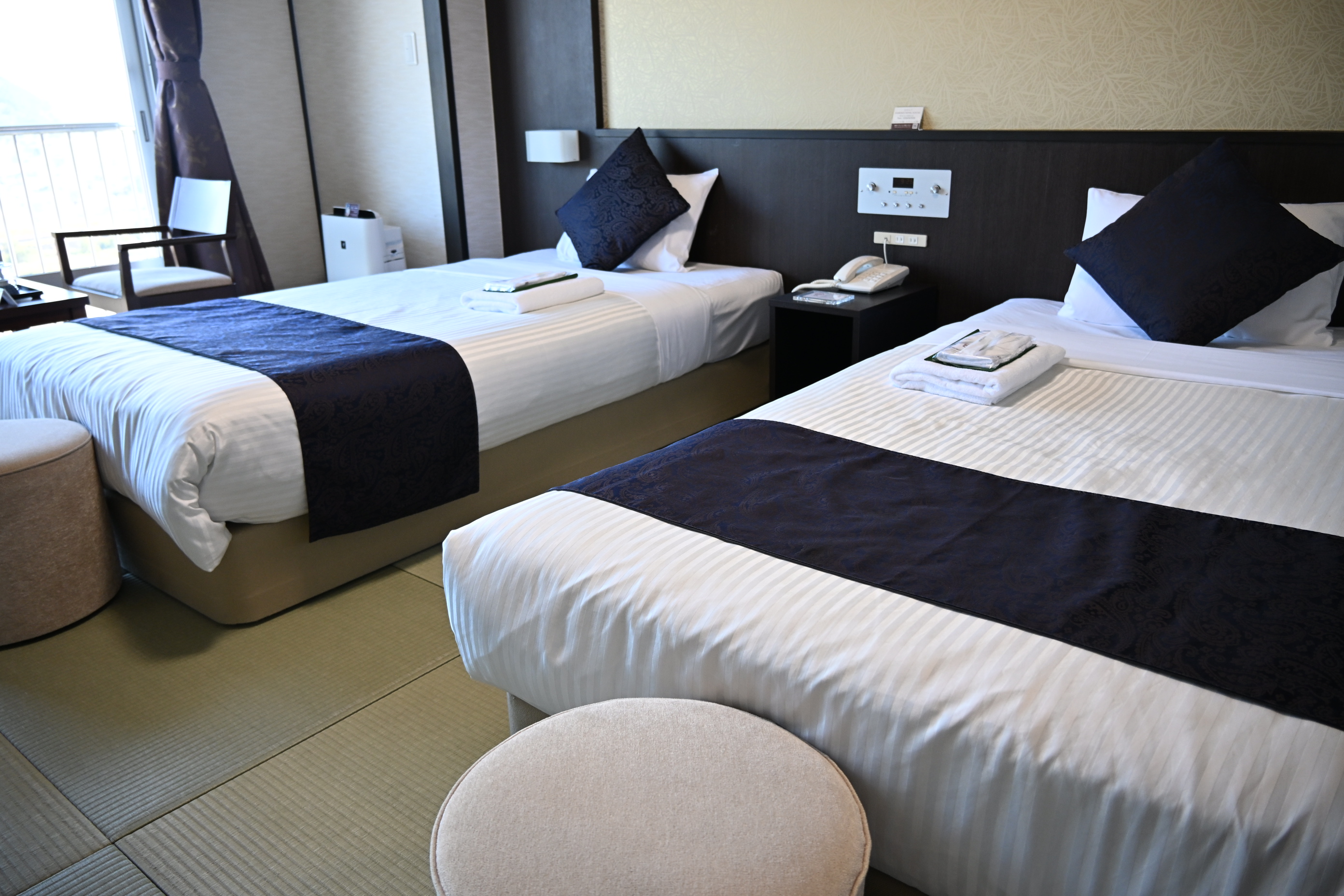 琉球畳が敷かれた和室にベッドが2台配置された、和モダンなお部屋。