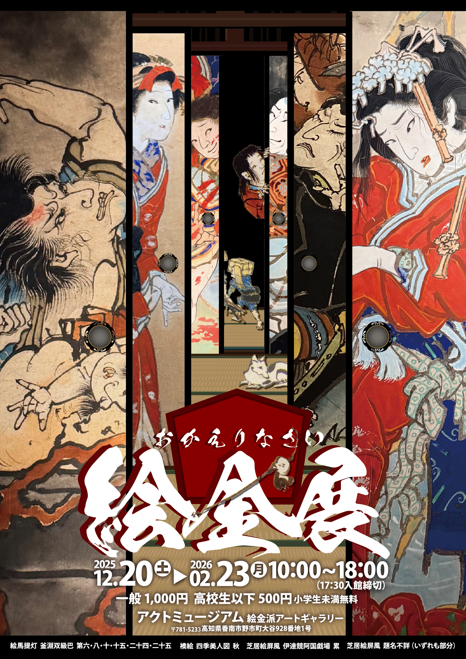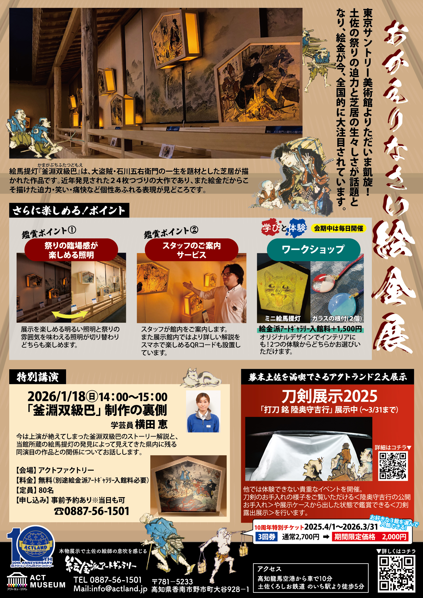 アクトミュージアムでは園内にある絵金派アートギャラリーにて、2026年2月23日(月)まで「 おかえりなさい絵金展 」を開催しています。アクトランド10周年のフィナーレを飾る企画展を、当園所蔵品の中でも注目度の高い「絵馬提灯」をメインに開催中です。9月に東京・サントリー美術館で開催された「幕末土佐の天才絵師 絵金」展は好評のうちに終わり、絵金は全国的に知名度が高まっています。その中で東京より戻ってきたアクトランド所蔵の絵馬提灯『 釜淵双級巴 』を地元でもご鑑賞いただける機会を設けました。