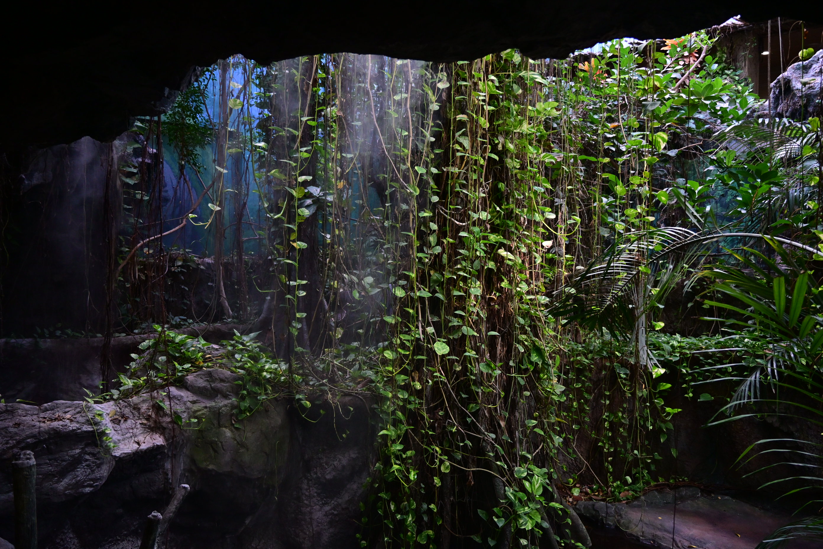 熱帯雨林のスコールや霧を再現した仕掛けもあって、本物のジャングルに迷い込んだような体験ができます。