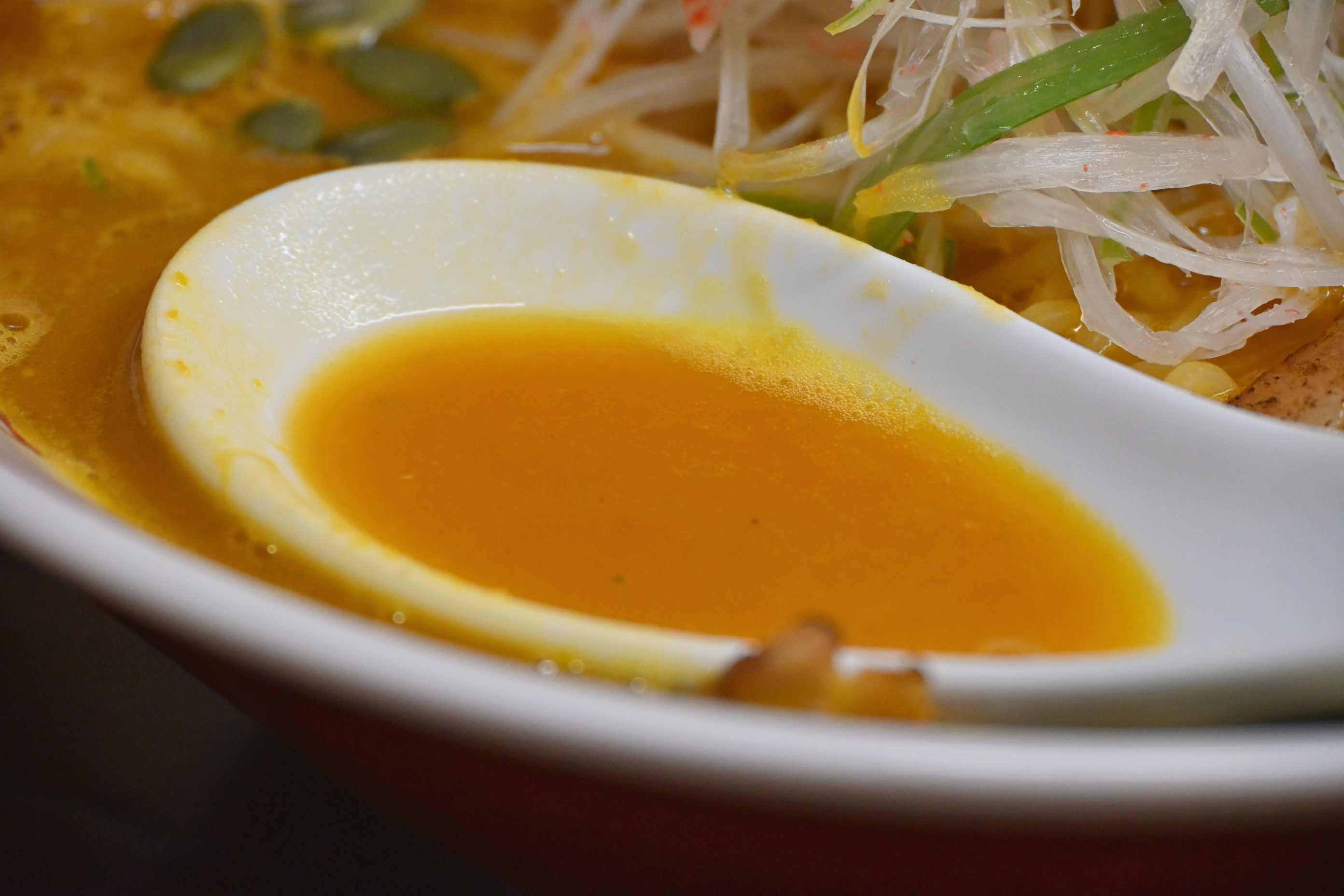 鶏ガラベースのスープにカボチャペーストを加えた一杯。