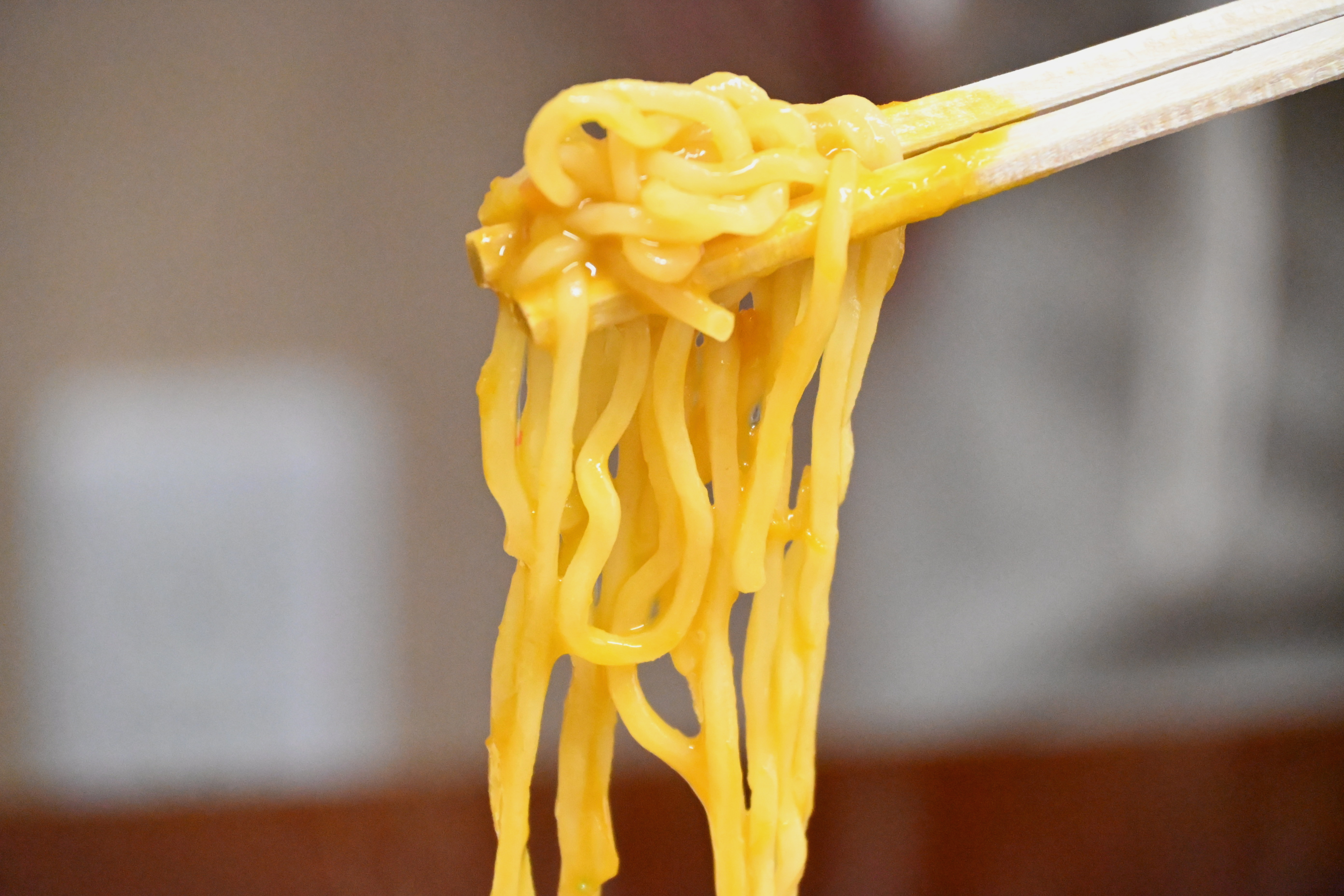 麺はちぢれ麺の細麺。トロミのあるスープがよく絡んでカボチャの美味しさを余すことなく堪能できます。