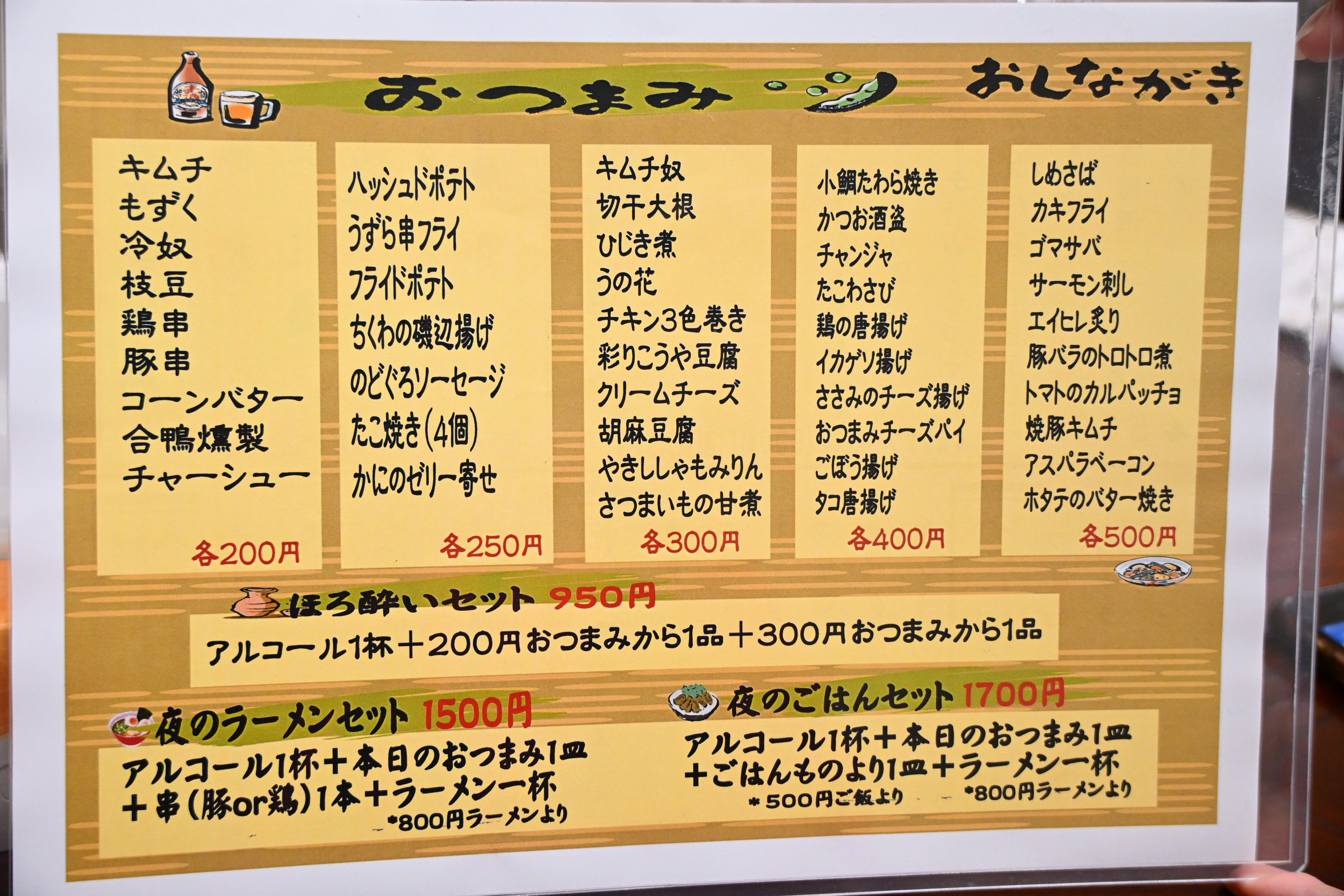 夜メニューもあります。〆の一杯にもおススメです。寒い時期には店の外にある席でおでんも楽しめますよ。