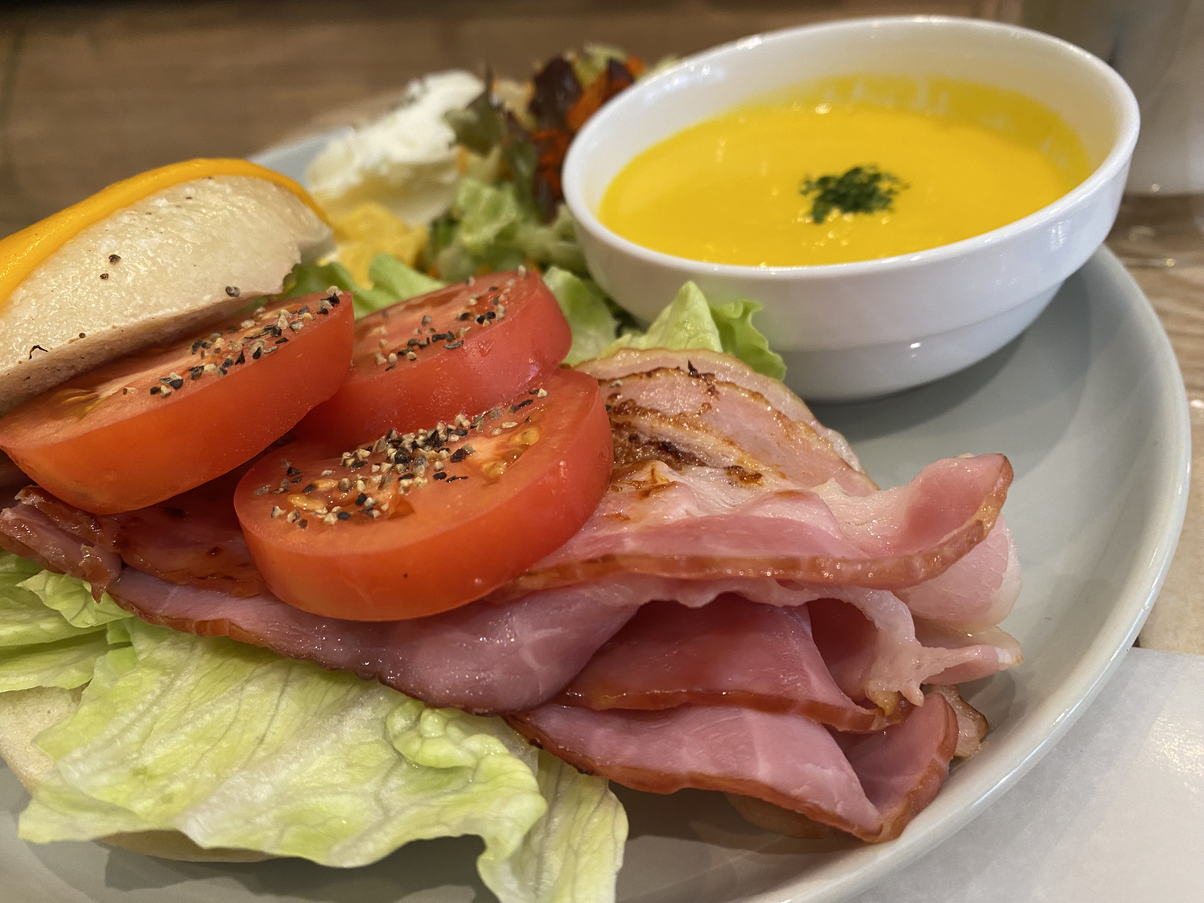 スモークサーモン or BLTのオープンサンドにスープ&ドリンクがついたプレート!
