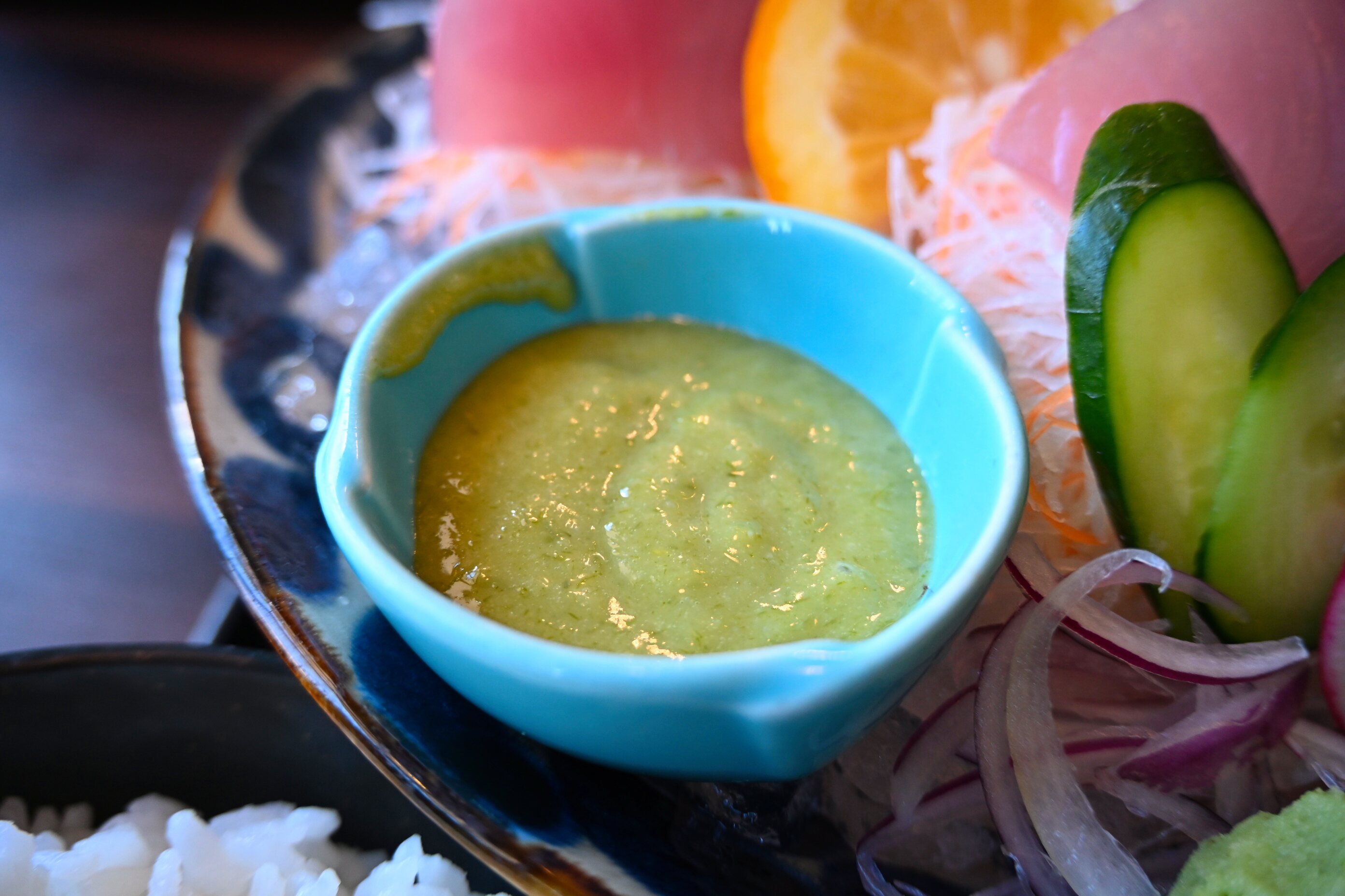 手作りのぬたは、酸味が効いていて魚によく合う味わい。脂っこ過ぎない、さっぱりとしたハマチにパンチを加えてくれます。刺身醤油とぬた、交互に食べても◎
