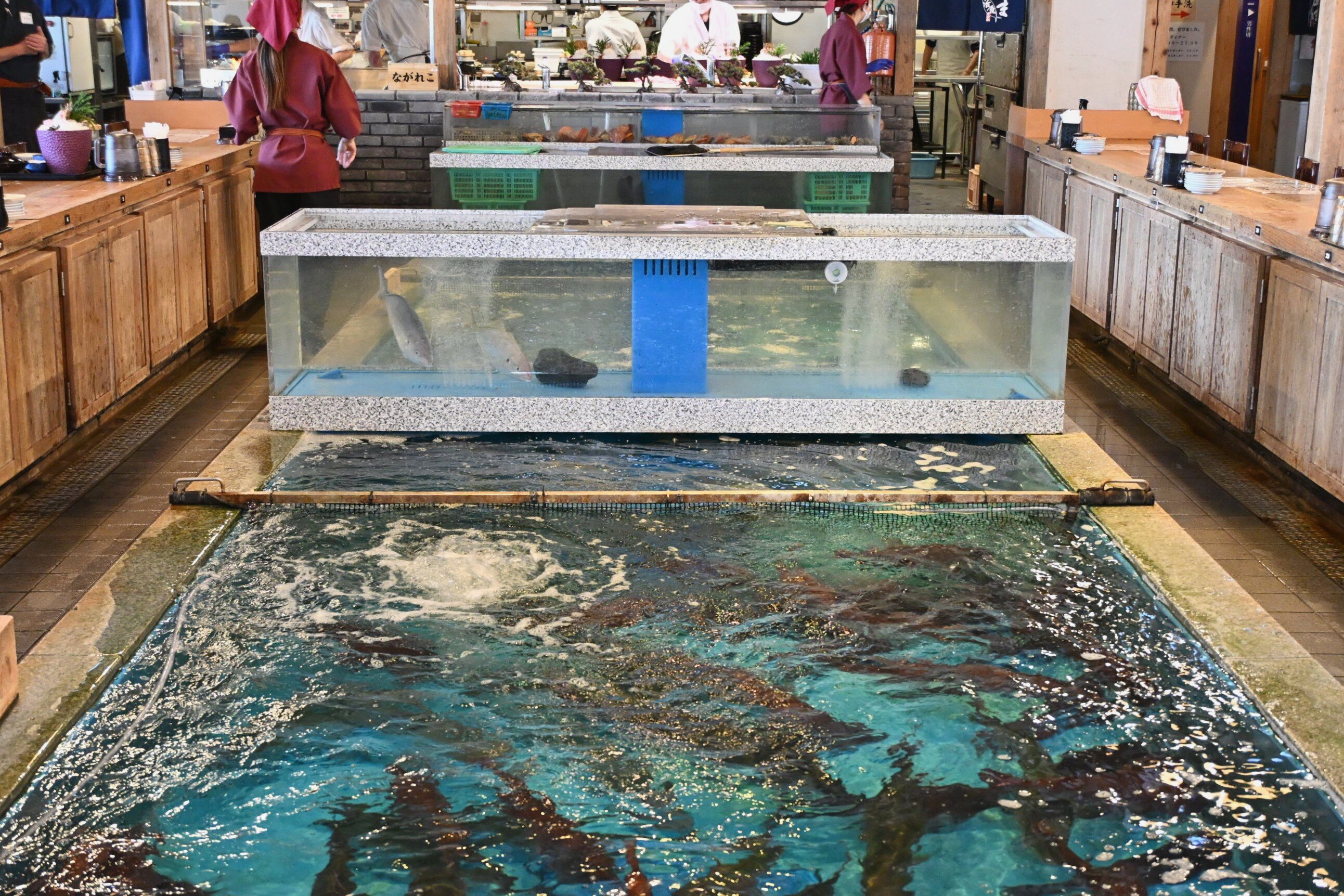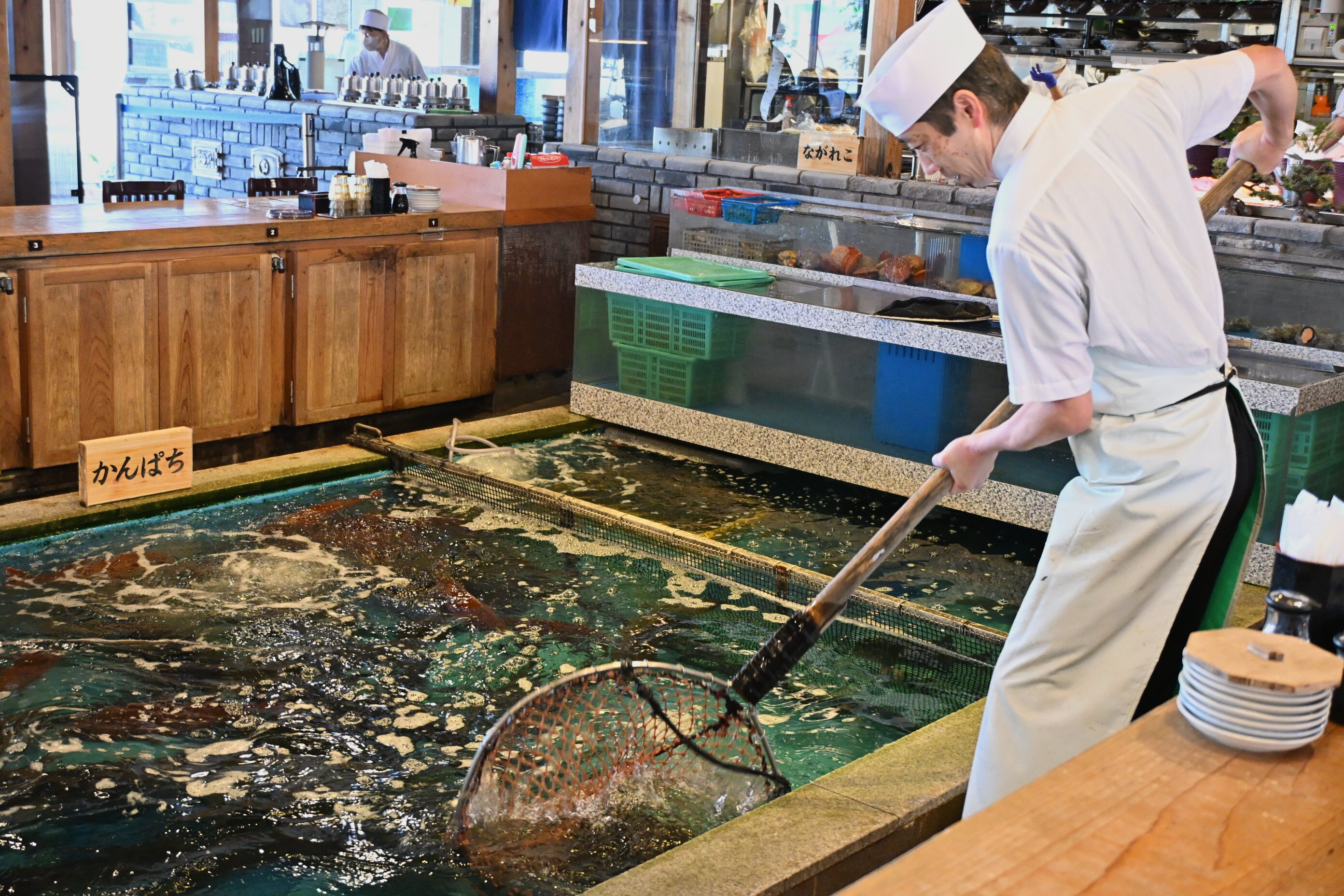 11時過ぎ、職人さんが生け簀から魚を引き上げます。このパフォーマンスも大人気。カウンター席ではスマートフォンのカメラを構えるお客さんの姿も。