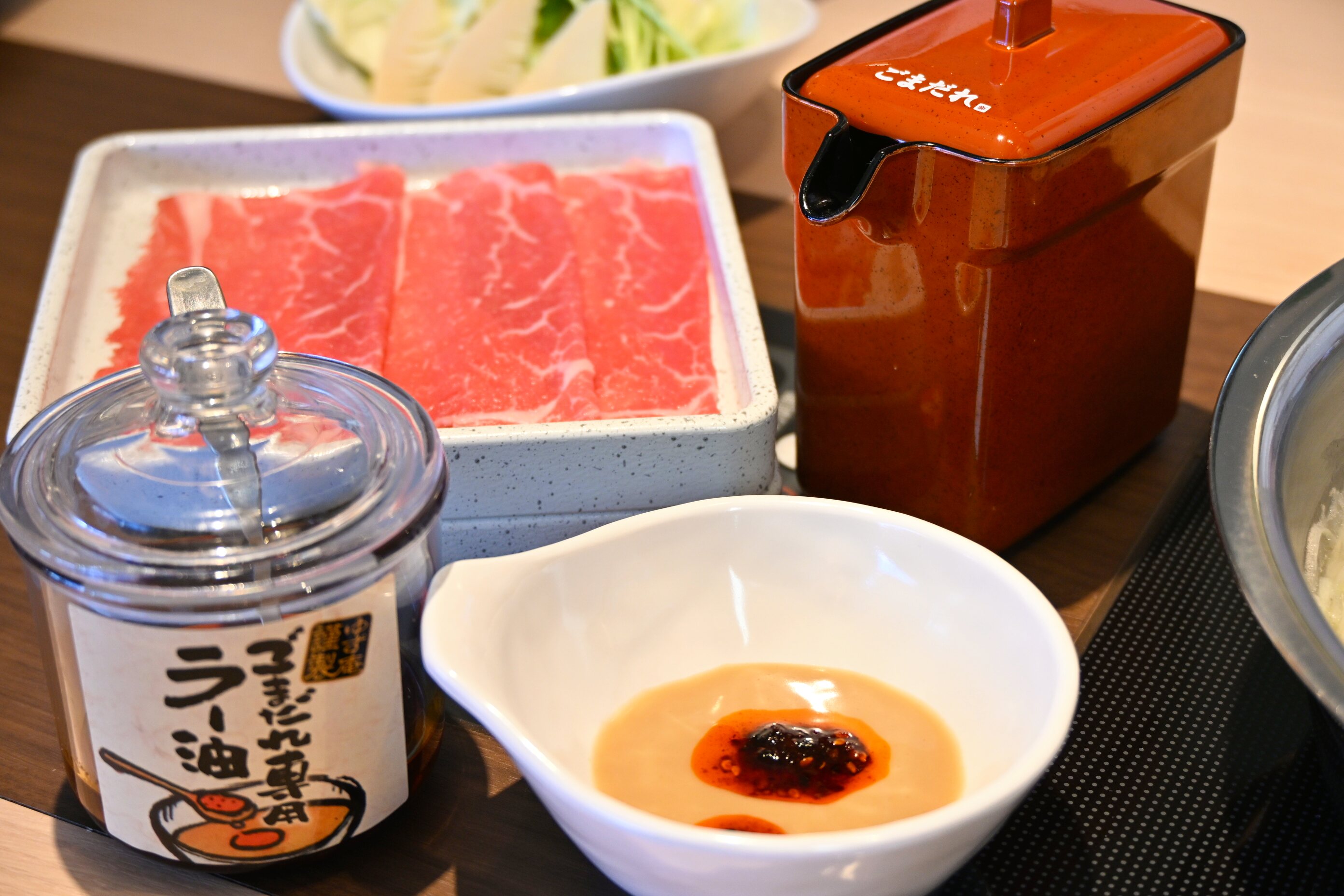 ラー油はごまだれ専用。豆乳鍋だし×ごまだれ×ラー油の相性は抜群。まろやかな豆乳に濃厚なごまだれのコク、ピリッとしたラー油の辛味、これはおいしい!ぐるぐるこうちスタッフも絶賛の味でした。