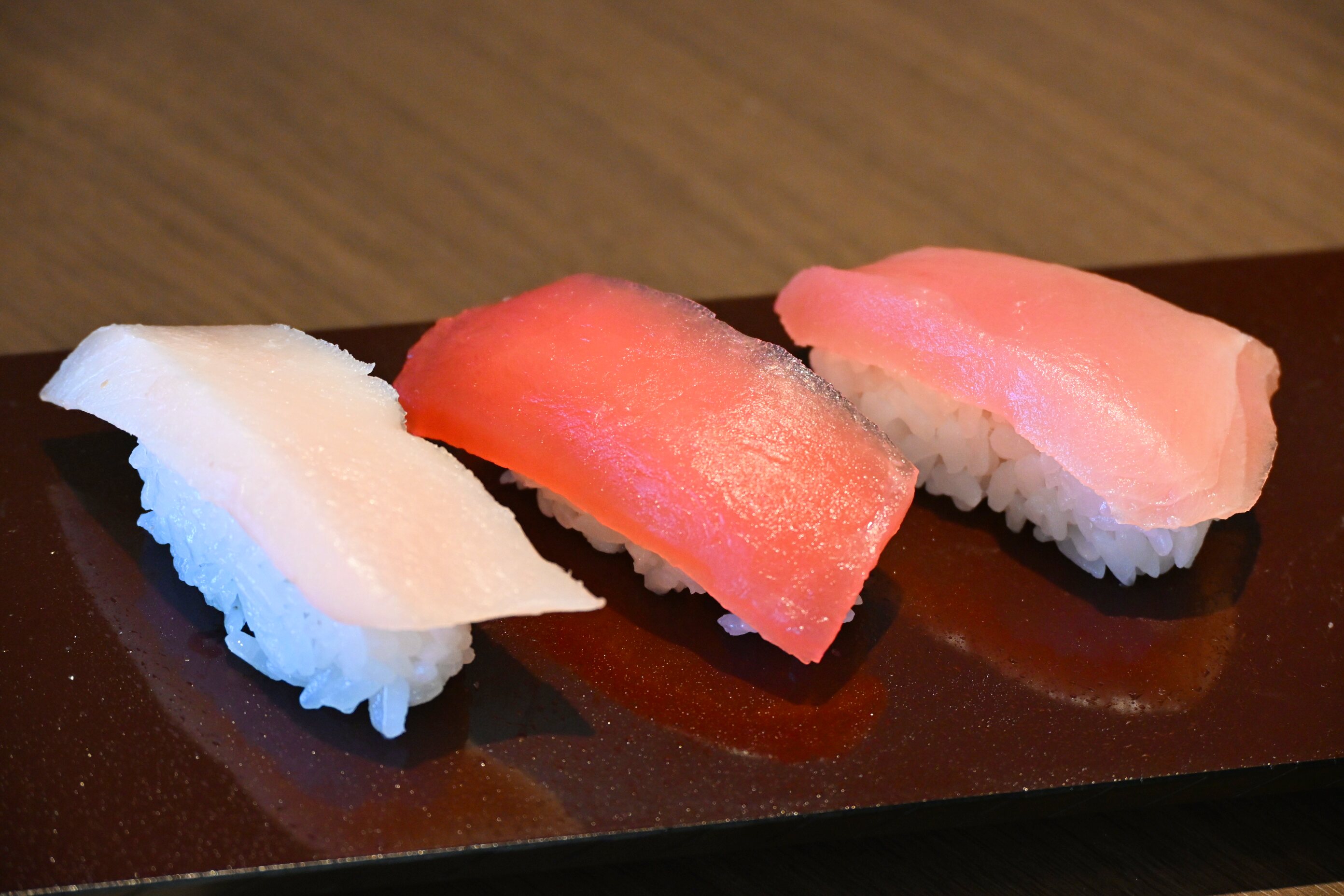 濃厚な中とろ、旨味豊かな赤身、上品なとろびんちょうが盛り合わせられた三貫セット。目利きが厳選したという赤身は40kg以上の大型魚体から、中トロは赤身と脂の比率を考え上質な鮪を使用!