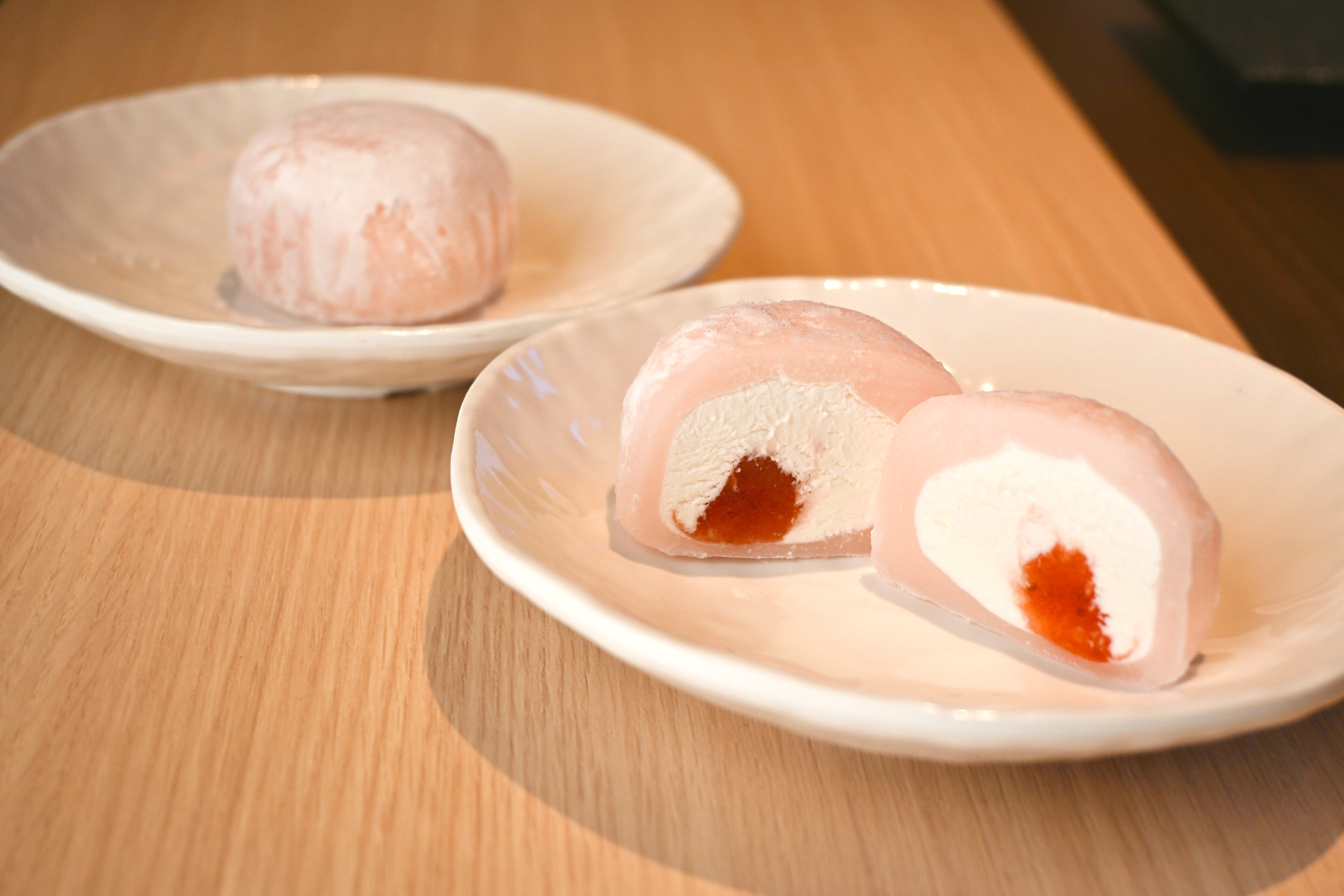 モチモチ食感の大福に、滑らかなイチゴクリームが楽しめる甘味は春限定の商品。