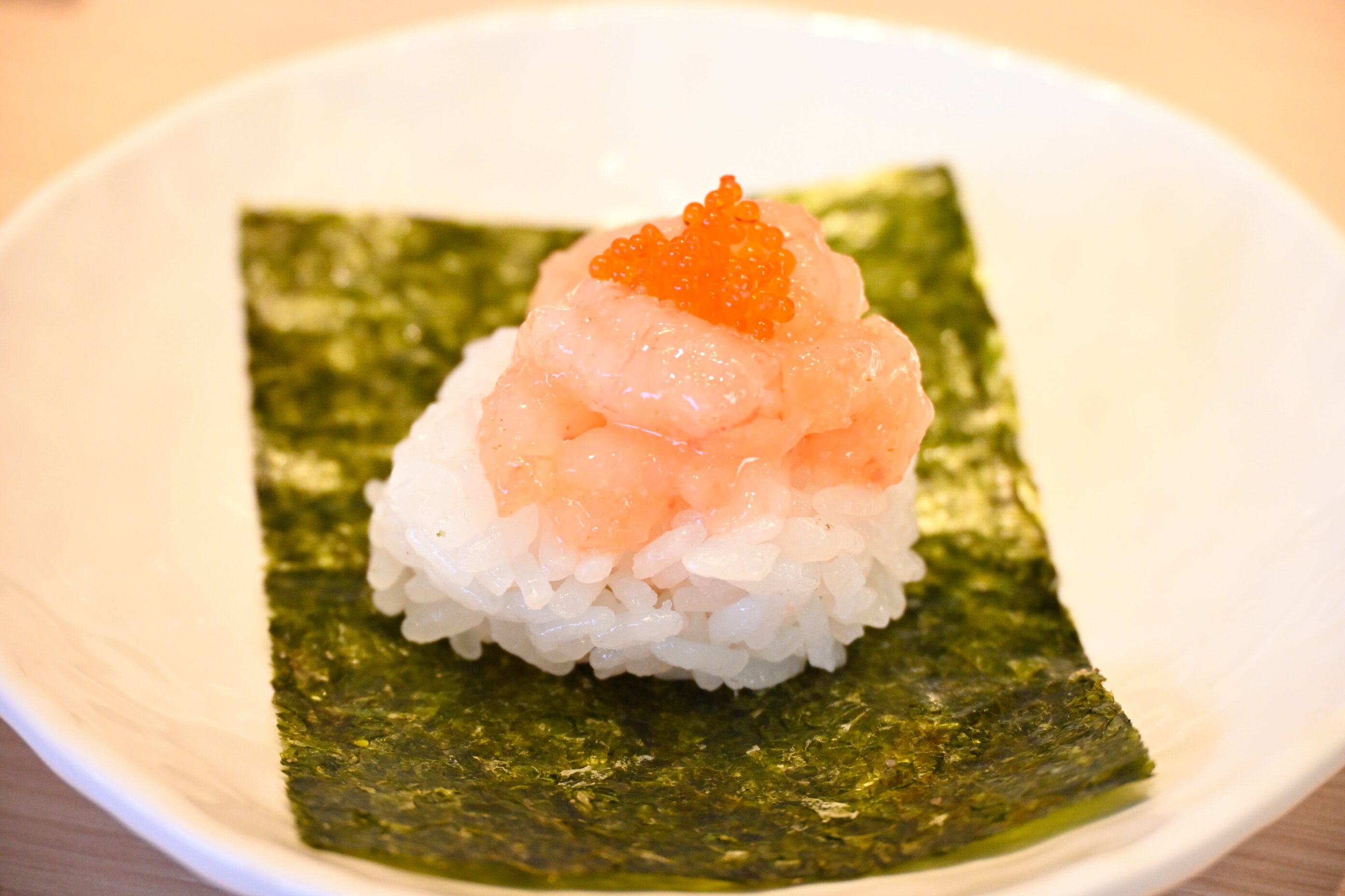 甘海老のとろっとした甘みと、明太子のマイルドな辛味、プチプチとした食感がアクセント!一口でパクっと食べるのがオススメです。